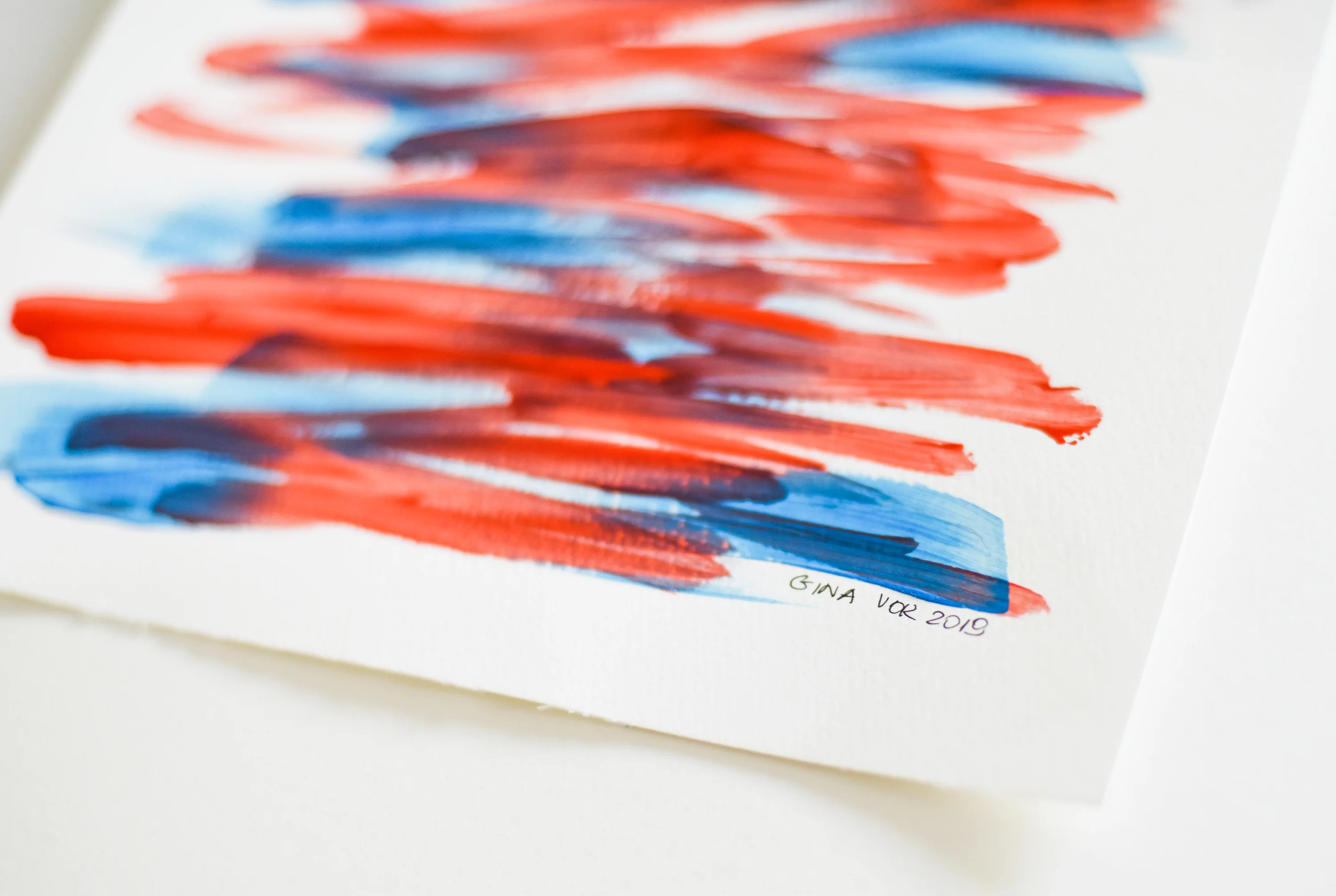 The painting belongs to the "Blues and Reds" series by Gina Vor (Switzerland), these small paintings dominated by bright blue and red colours are expressive yet minimalist.
