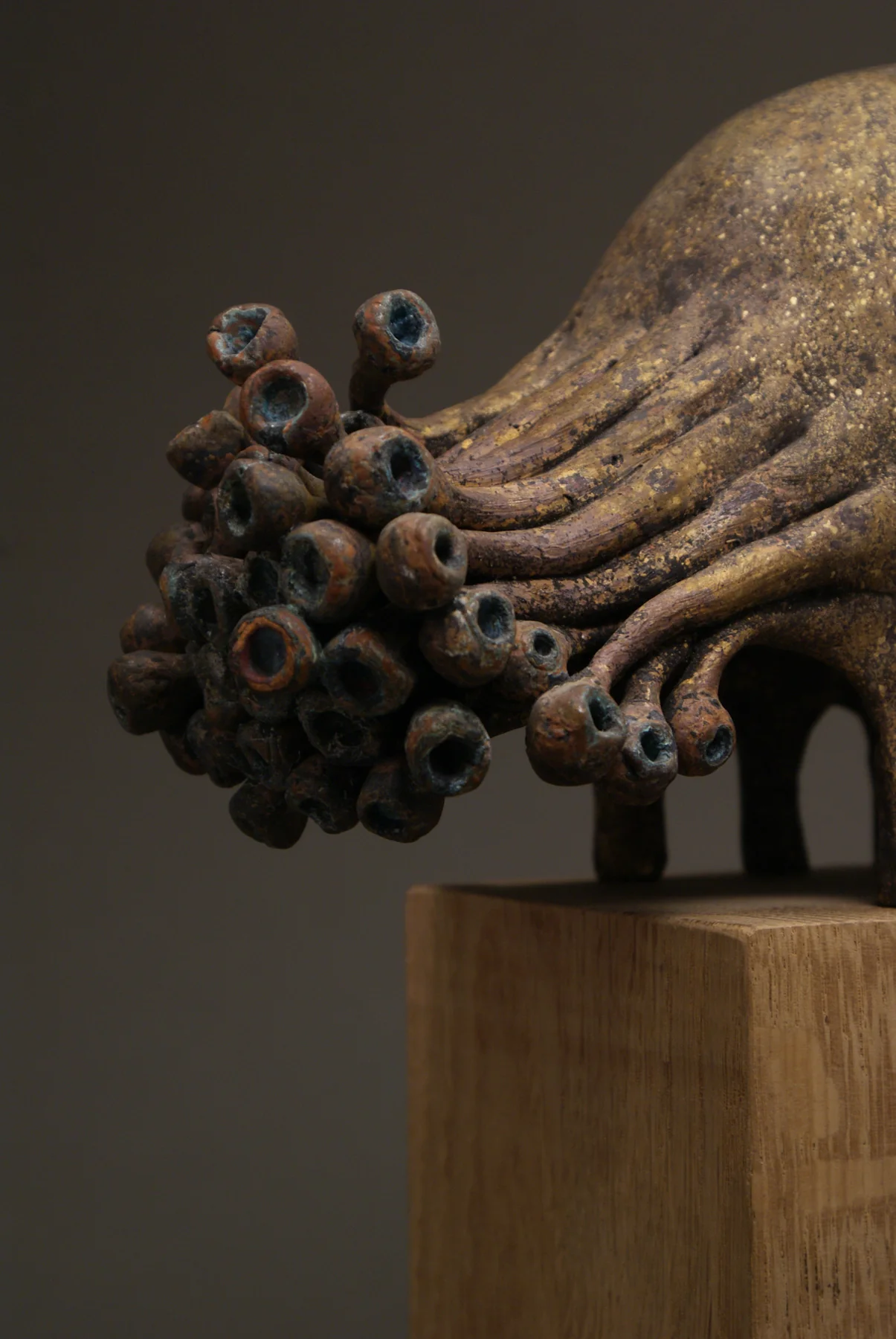 This sculpture portrays a surrealistic creature living in a moss, under slots of soil and timber. The artwork captures the moment when this creature was suddenly caught by a gust of wind and carried away, deep into the woods.
