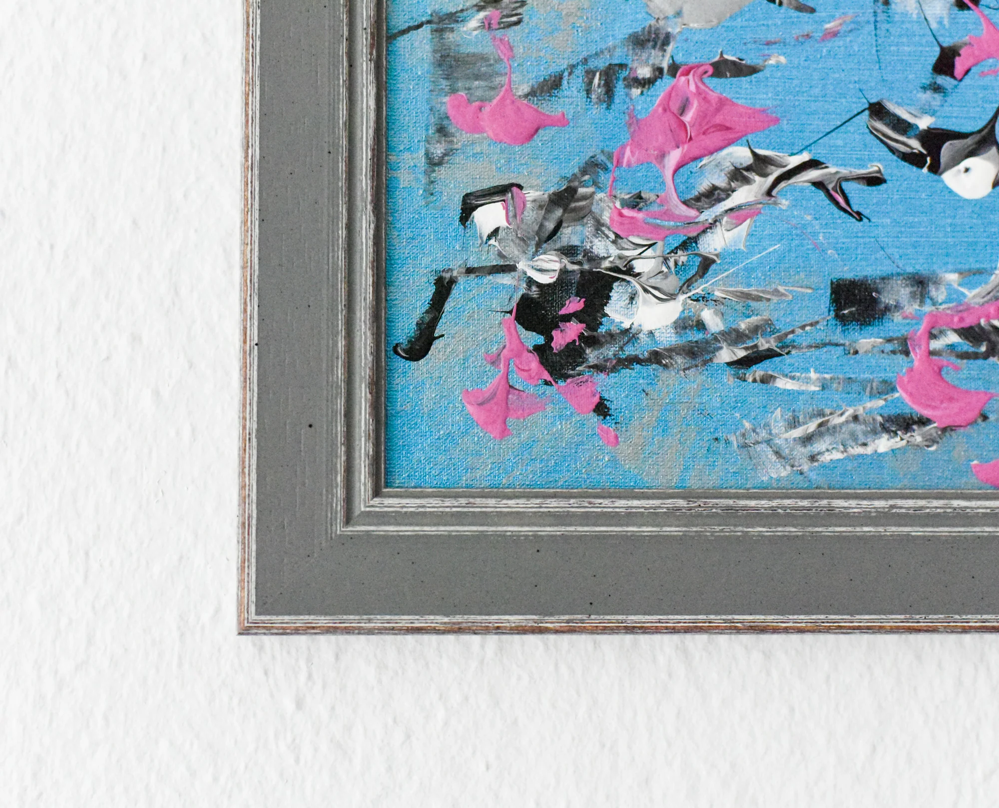 This sweet little abstraction is executed on metallic blue background, with splashes of silver, pink, black and white colours. Gentle shine gives makes this artwork look different as the day passed by. Just like diamond it has various reflections.