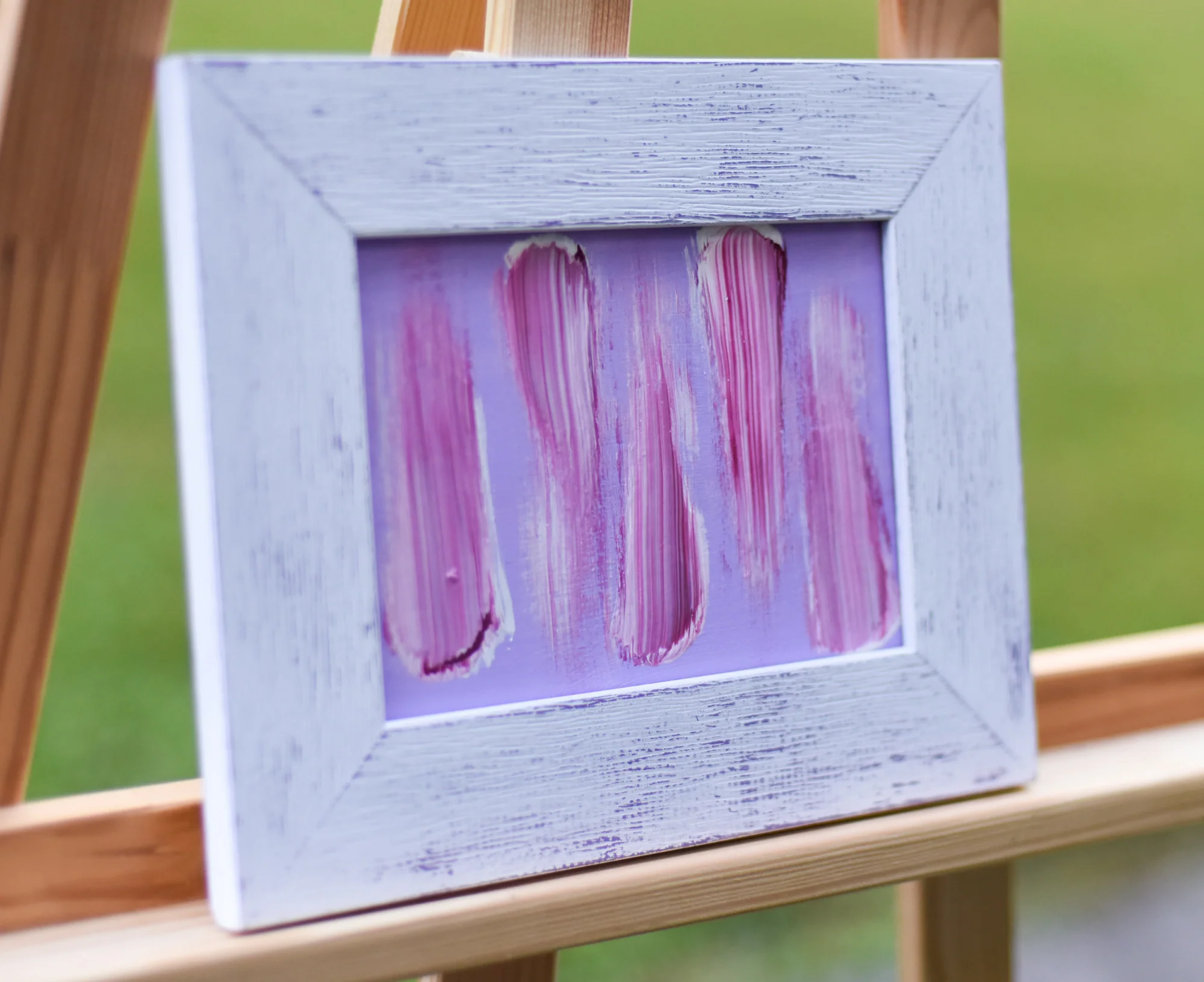 Small pink abstract painting sold with a vintage frame, ready to hang.