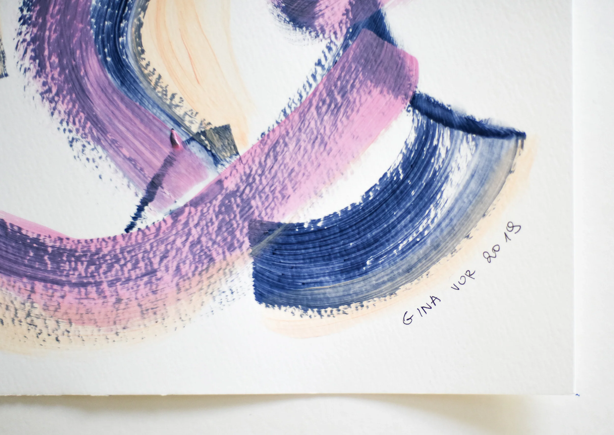 The painting belongs to the "Melting" series by Gina Vor (Switzerland), these minimalist artworks are dominated by soft colour palette of blush pink, navy blue and beige. The series are inspired by all pleasant feelings that make us feel like melting - whether it is a very nice musical composition or a delicious ice cream.