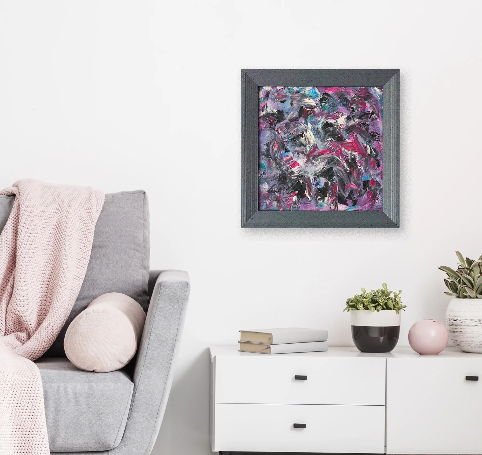 Abstract painting, expressive textured miniature on canvas, framed and ready to hang.