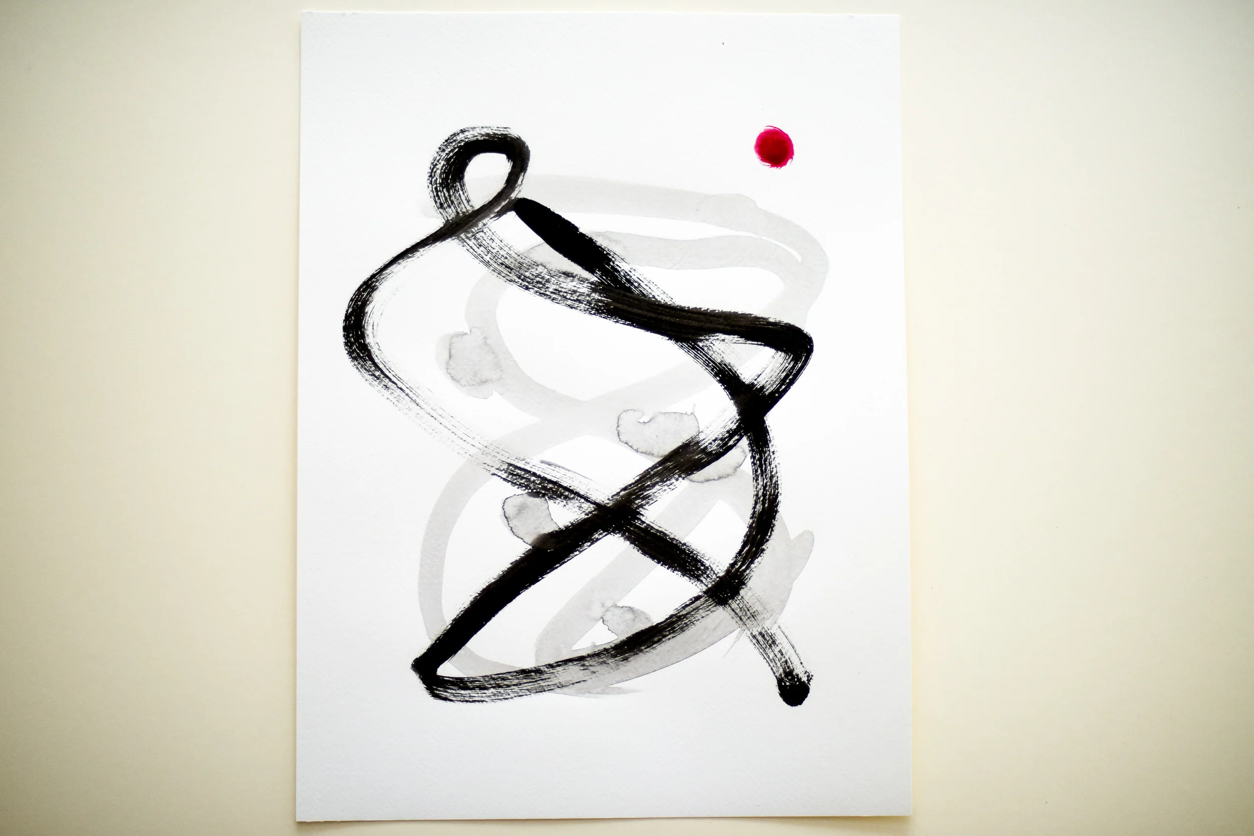 Original abstract painting on paper, unique linear ink drawing, contemporary work of art created with black and red watercolour inks.