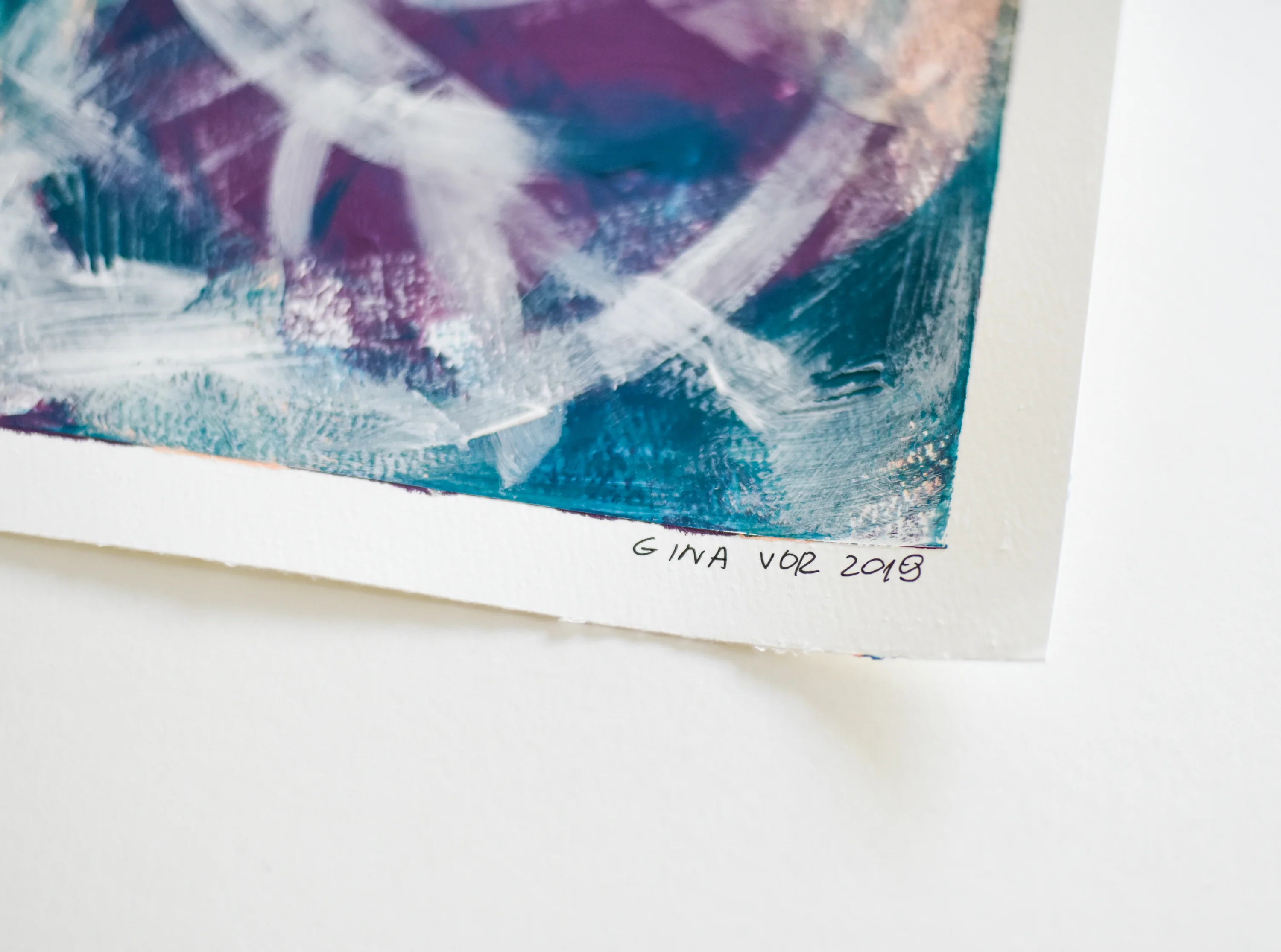 The painting belongs to the "Waterfall" series by Gina Vor (Switzerland). The artwork is rich in texture and colour.