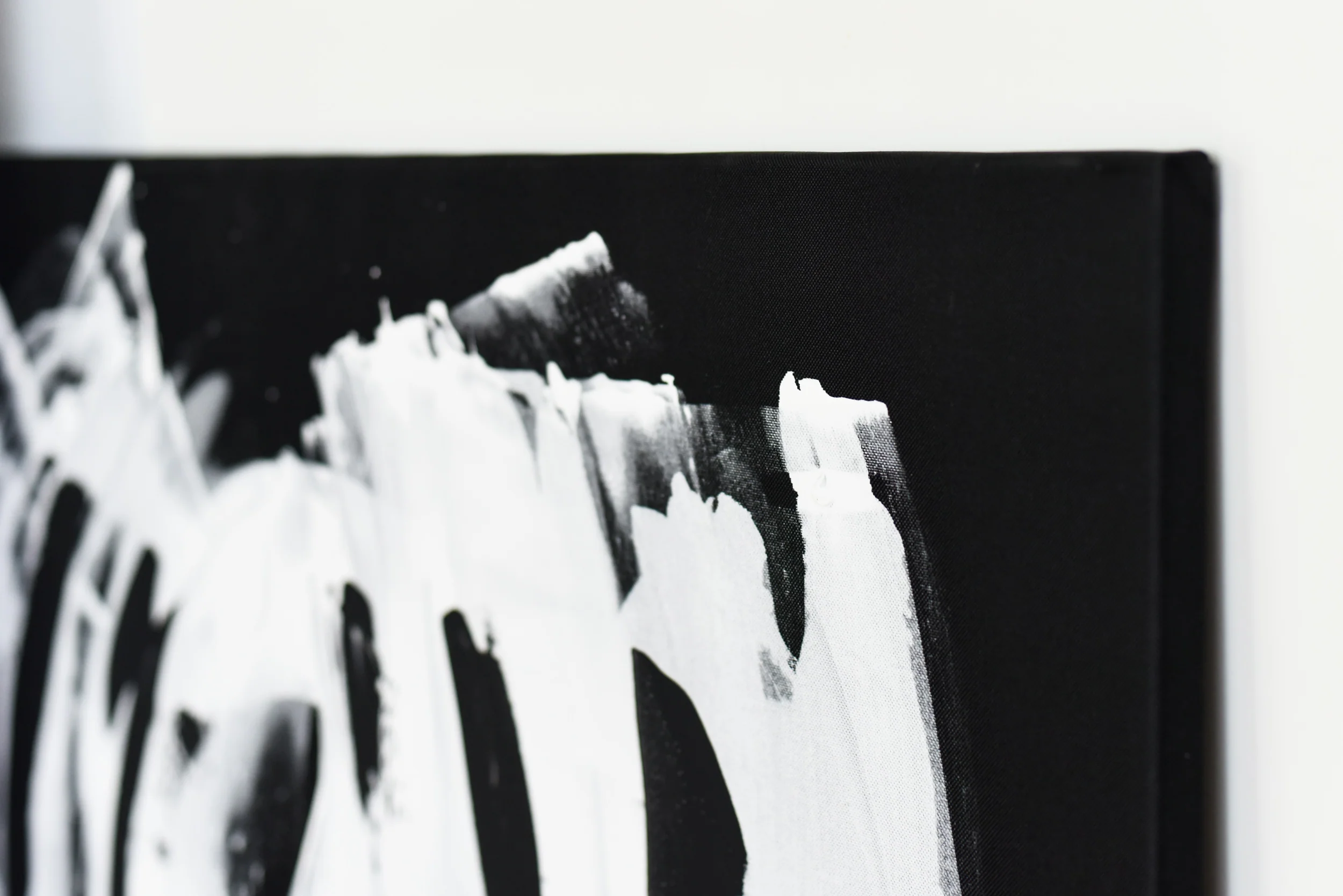 Large black and white abstract painting, original artwork sold stretched and ready to hang.