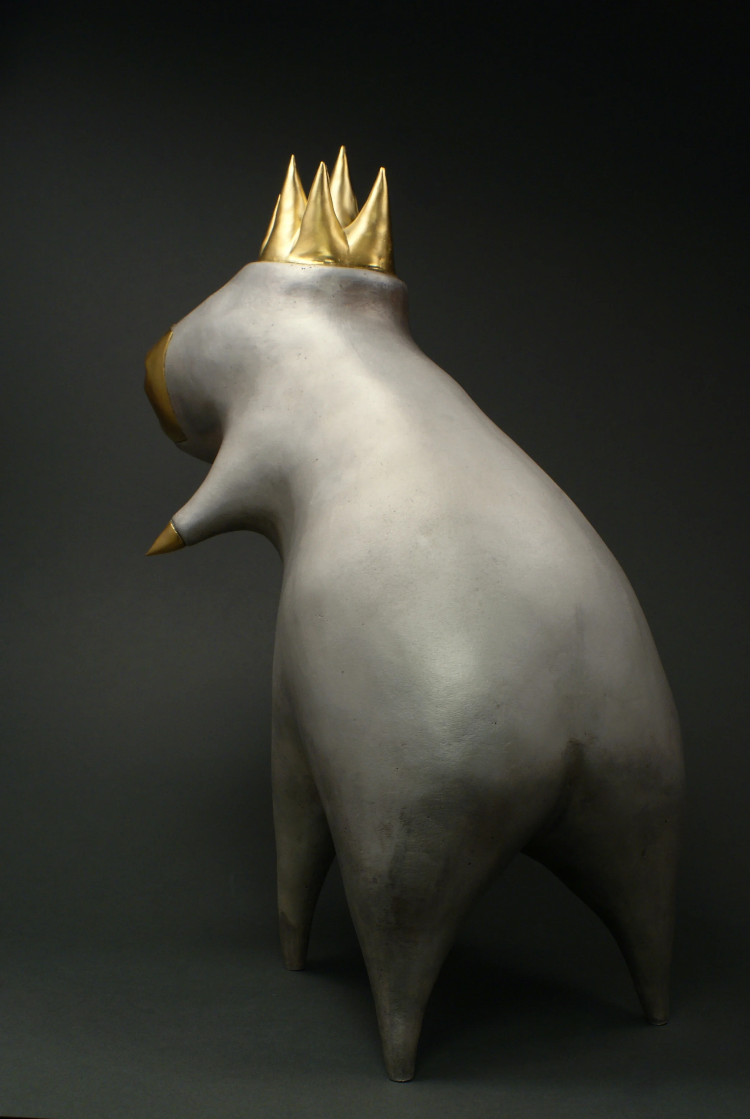 This silver-plated sculpture represents strong character, full of self esteem. The creature is proud of itself and wears a crown.