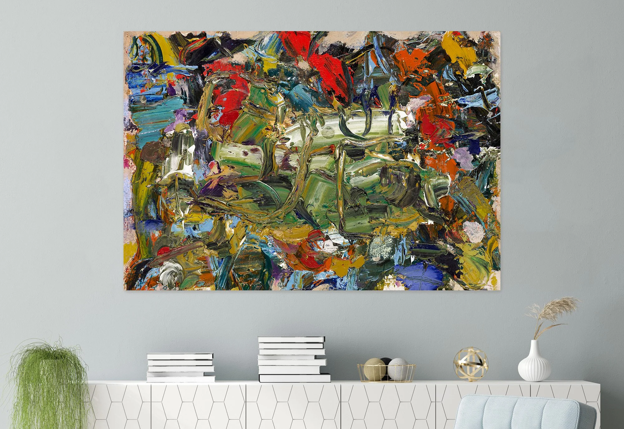 This abstraction, painted in expressive brush strokes of greens, reds and blue was reborn thanks to a contemporary technology that added even more vibrance and more emotional impact. The artwork is calming and invites the viewer for a peaceful meditation.